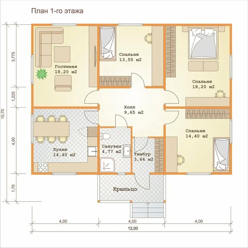Планировка дома 12х12 одноэтажный с 3 спальнями кухня-гостиная