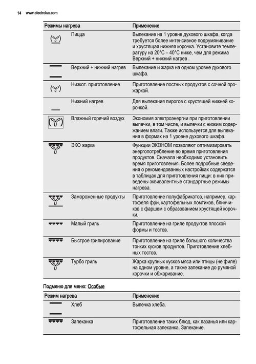 Электролюкс духовой шкаф инструкция режимы выпечки