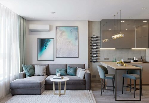 Интерьер прямоугольной кухни гостиной